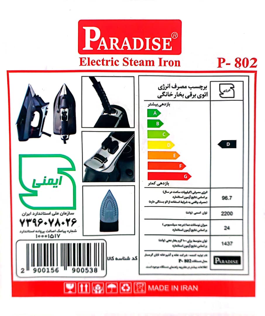 - اتو بخار پارادایس مدل P-802 با طراحی ارگونومیک و کاربری آسان